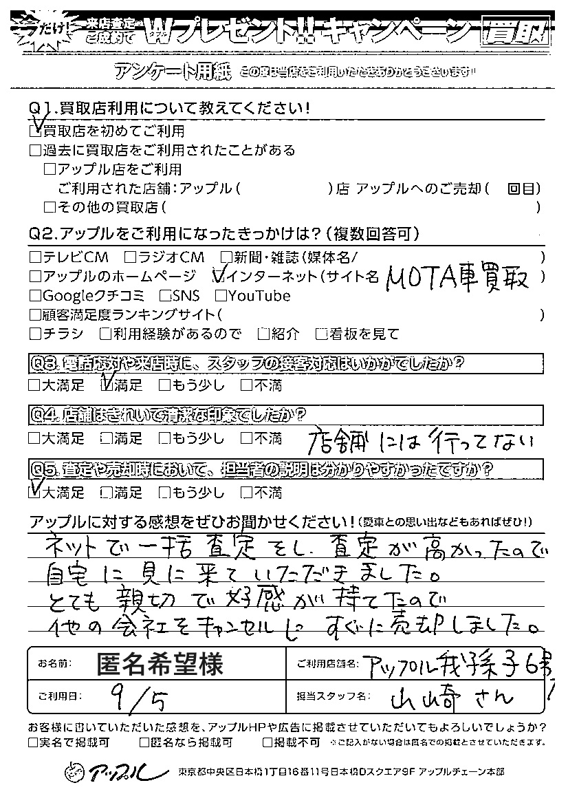 お車のご相談・ 査定だけでもOK! カンタン 入力 30秒 アップルがブランド買取始めました! お電話でも受付中! 受付時間10:00 ~ 19:00 04-7182-5411 お車のご相談・ 査定だけでもOK! カンタン 入力 30秒 アップルがブランド買取始めました! お電話でも受付中! 受付時間10:00 ~ 19:00 04-7182-5411 アップルがブランド買取始めました! お電話でも受付中! 受付時間10:00 ~ 19:00 04-7182-5411 店舗情報 在庫車 スタッフ紹介 ブログ お客様の声 キャンペーン 無料査定 click お客様の声 ご記入日: 2023/09/05 匿名希望様 Q:アップルに対する感想をぜひお聞かせください!大満足ネットで一括査定をし、査定が高かったので自宅に見に来ていただきました。とても親切で好感が持てたので他の会社をキャンセルしすぐに売却しました。 前へ 次へ お客様の声一覧を見る