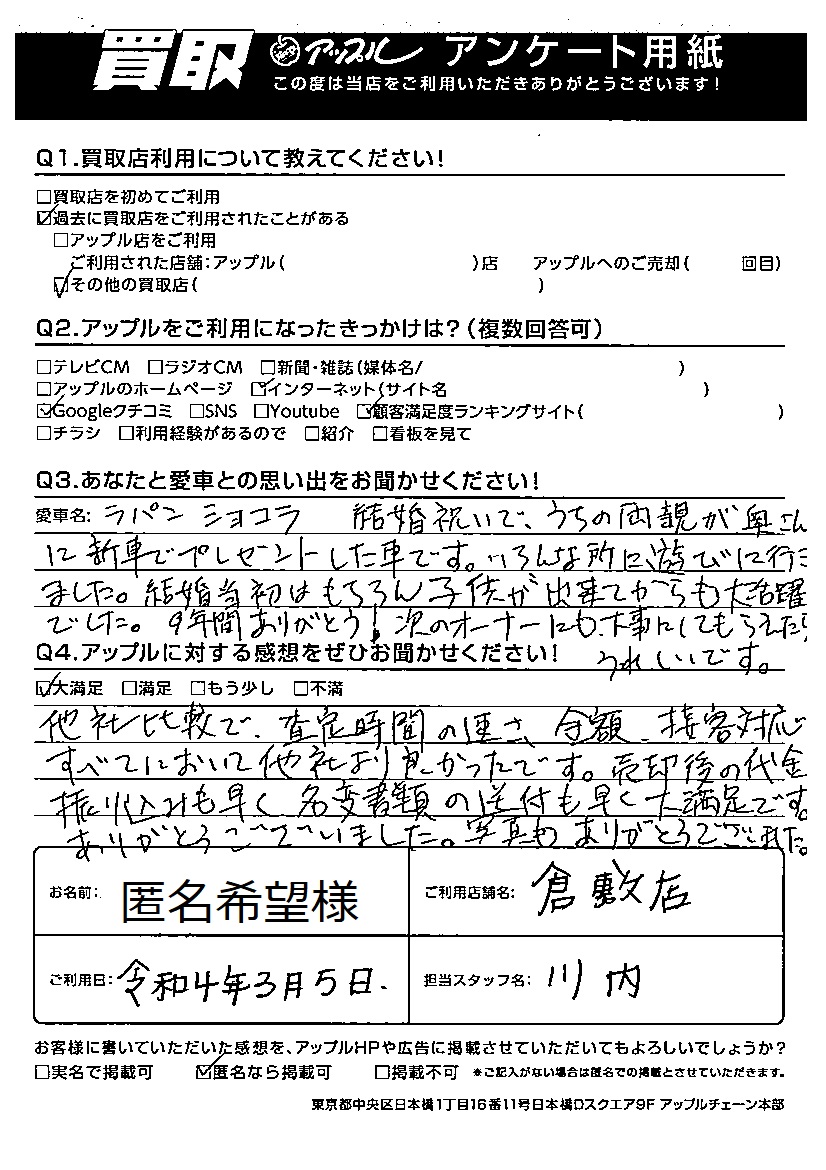 他社比較で、査定時間の速さ、金額、接客対応すべてにおいて他社より良かったです。売却後の代金振り込みも早く名変書類の送付も早く大満足です。