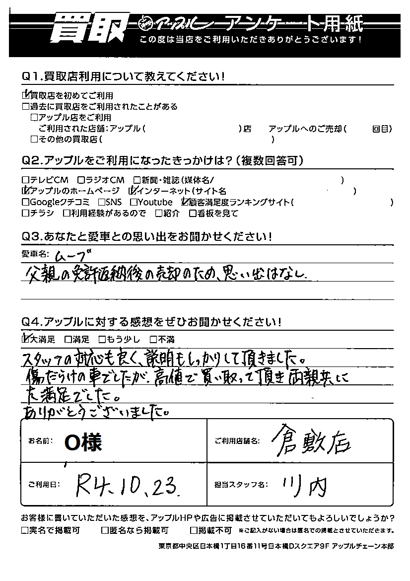 傷だらけの車でしたが、高値で買い取って頂き両親共に大満足でした。