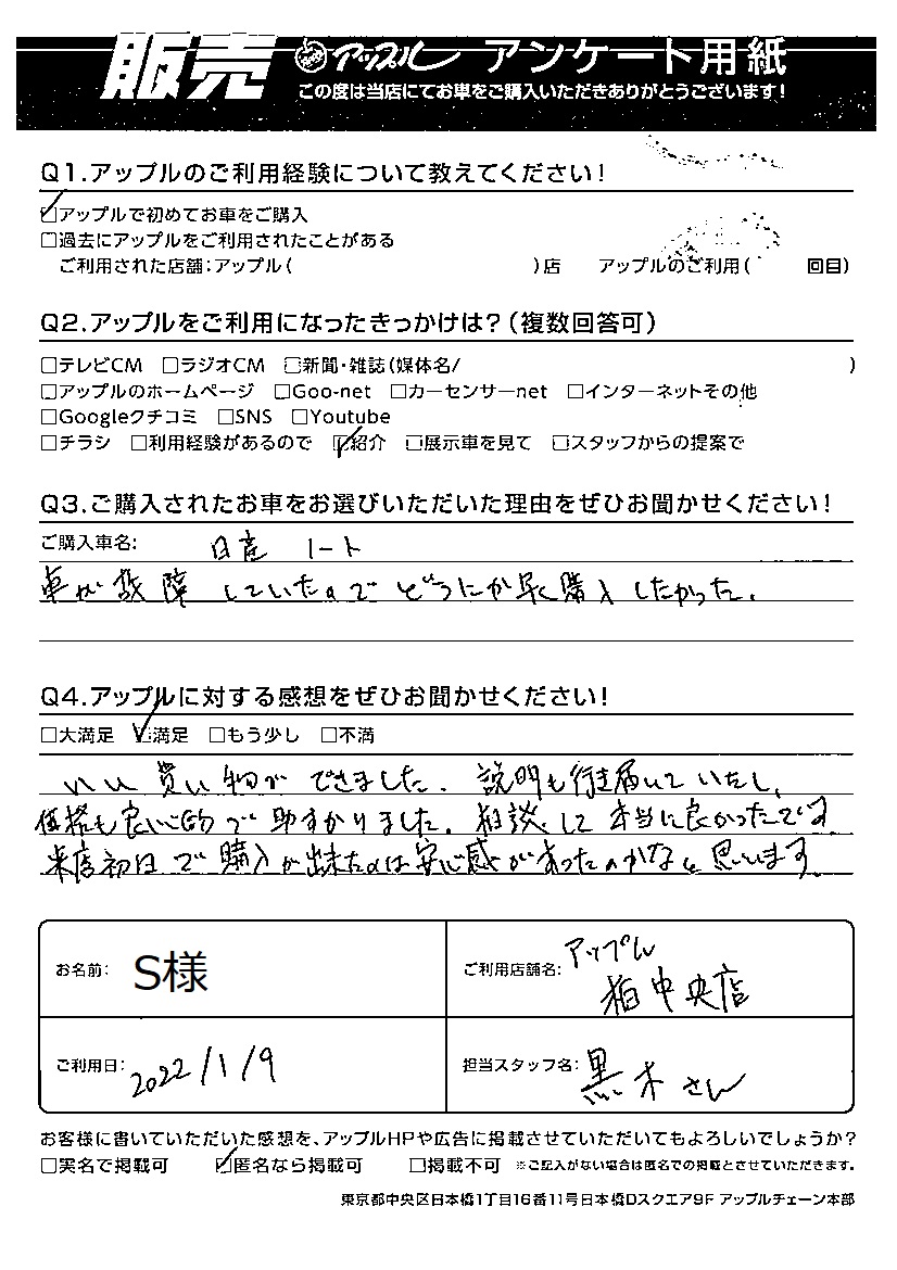 お車のご相談・ 査定だけでもOK! カンタン 入力 30秒 アップルがブランド買取始めました! お電話でも受付中! 受付時間10:00 ~ 19:00 04-7197-4436 お車のご相談・ 査定だけでもOK! カンタン 入力 30秒 アップルがブランド買取始めました! お電話でも受付中! 受付時間10:00 ~ 19:00 04-7197-4436 アップルがブランド買取始めました! お電話でも受付中! 受付時間10:00 ~ 19:00 04-7197-4436 店舗情報 在庫車 スタッフ紹介 ブログ お客様の声 キャンペーン 無料査定 click お客様の声 ご記入日: 2022/01/09 千葉県我孫子市 S様 車名:日産 ノート いい買い物ができました。説明も行き届いていたし、価格も良心的で助かりました。相談して本当に良かったです。来店初日で購入が出来たのは安心感があったのかなと思います。 前へ 次へ お客様の声一覧を見る