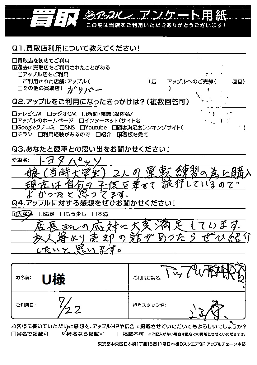 お車のご相談・ 査定だけでもOK! カンタン 入力 30秒 アップルがブランド買取始めました! お電話でも受付中! 受付時間10:00 ~ 19:00 04-7197-4436 お車のご相談・ 査定だけでもOK! カンタン 入力 30秒 アップルがブランド買取始めました! お電話でも受付中! 受付時間10:00 ~ 19:00 04-7197-4436 アップルがブランド買取始めました! お電話でも受付中! 受付時間10:00 ~ 19:00 04-7197-4436 店舗情報 在庫車 スタッフ紹介 ブログ お客様の声 キャンペーン 無料査定 click お客様の声 ご記入日: 2022/07/22 千葉県松戸市 U様 車名:トヨタ パッソ 店長さんの対応に大変満足しています。友人等より売却の話があったらぜひ紹介したいと思います。 前へ 次へ お客様の声一覧を見る