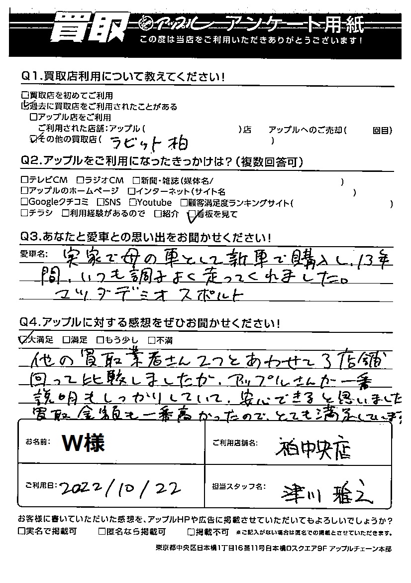 お車のご相談・ 査定だけでもOK! カンタン 入力 30秒 アップルがブランド買取始めました! お電話でも受付中! 受付時間10:00 ~ 19:00 04-7197-4436 お車のご相談・ 査定だけでもOK! カンタン 入力 30秒 アップルがブランド買取始めました! お電話でも受付中! 受付時間10:00 ~ 19:00 04-7197-4436 アップルがブランド買取始めました! お電話でも受付中! 受付時間10:00 ~ 19:00 04-7197-4436 店舗情報 在庫車 スタッフ紹介 ブログ お客様の声 キャンペーン 無料査定 click お客様の声 ご記入日: 2022/10/22 千葉県柏市 W様 車名:マツダ デミオ 他の買取業者さん2つとあわせて3店舗回って比較しましたが、アップルさんが一番説明もしっかりしていて、安心できると思いました。買取金額も一番高かったので、とても満足しています。 前へ 次へ お客様の声一覧を見る