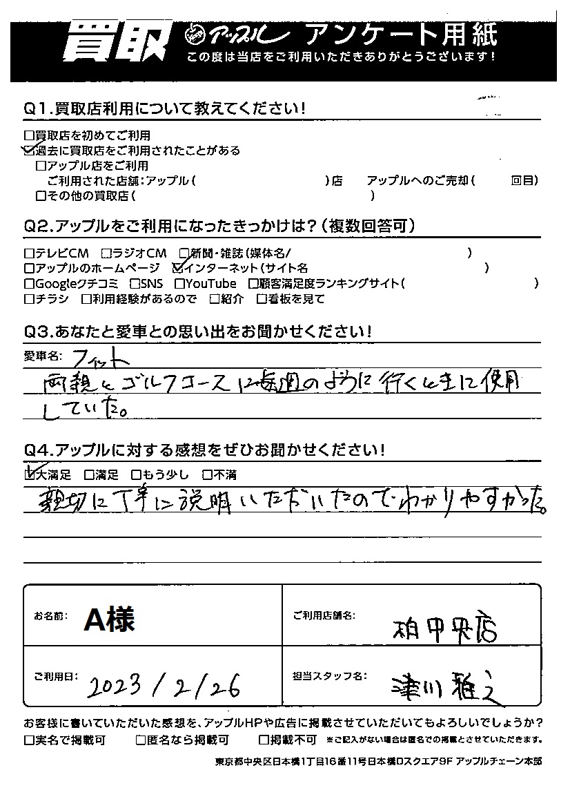 お車のご相談・ 査定だけでもOK! カンタン 入力 30秒 アップルがブランド買取始めました! お電話でも受付中! 受付時間10:00 ~ 19:00 04-7197-4436 お車のご相談・ 査定だけでもOK! カンタン 入力 30秒 アップルがブランド買取始めました! お電話でも受付中! 受付時間10:00 ~ 19:00 04-7197-4436 アップルがブランド買取始めました! お電話でも受付中! 受付時間10:00 ~ 19:00 04-7197-4436 店舗情報 在庫車 スタッフ紹介 ブログ お客様の声 キャンペーン 無料査定 click お客様の声 ご記入日: 2023/02/26 東京都江東区 A様 車名:ホンダ フィット(H25年9月以降のハイブリッド含む) 親切に丁寧に説明いただいたのでわかりやすかった。 前へ 次へ お客様の声一覧を見る