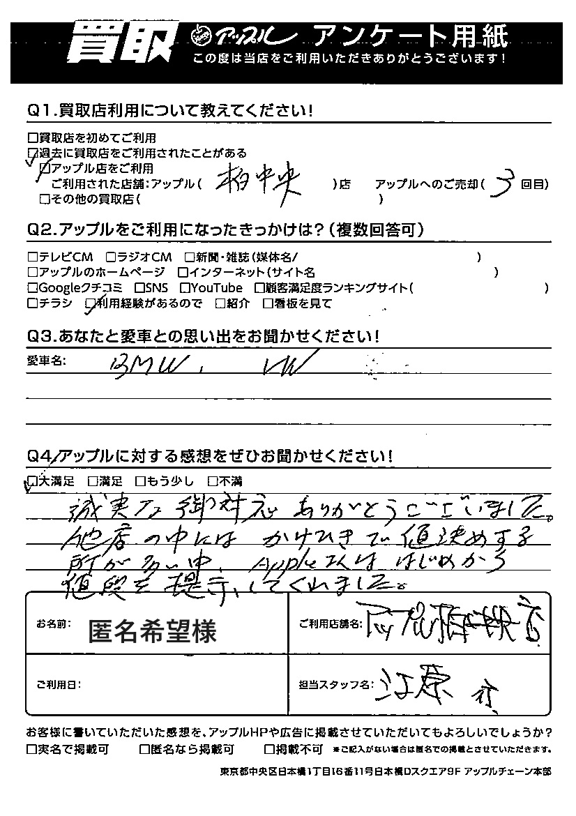お車のご相談・ 査定だけでもOK! カンタン 入力 30秒 アップルがブランド買取始めました! お電話でも受付中! 受付時間10:00 ~ 19:00 04-7197-4436 お車のご相談・ 査定だけでもOK! カンタン 入力 30秒 アップルがブランド買取始めました! お電話でも受付中! 受付時間10:00 ~ 19:00 04-7197-4436 アップルがブランド買取始めました! お電話でも受付中! 受付時間10:00 ~ 19:00 04-7197-4436 店舗情報 在庫車 スタッフ紹介 ブログ お客様の声 キャンペーン 無料査定 click お客様の声 ご記入日: 2023/05/19 千葉県柏市 T様 車名:フォルクスワーゲン ポロ 誠実な御対応ありがとうございました。他店の中にはかけひきで値決めする所が多い中、Appleさんははじめから値段を提示してくれました。 前へ 次へ お客様の声一覧を見る