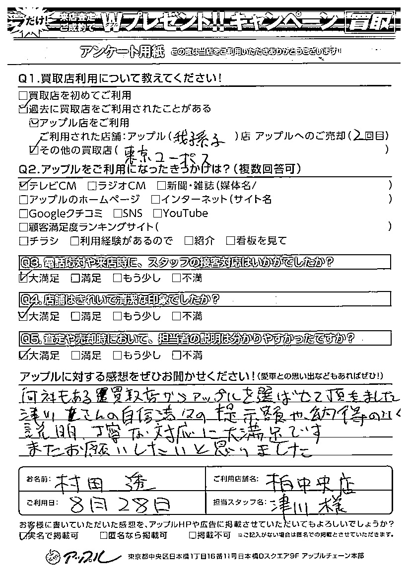 お車のご相談・ 査定だけでもOK! カンタン 入力 30秒 アップルがブランド買取始めました! お電話でも受付中! 受付時間10:00 ~ 19:00 04-7197-4436 お車のご相談・ 査定だけでもOK! カンタン 入力 30秒 アップルがブランド買取始めました! お電話でも受付中! 受付時間10:00 ~ 19:00 04-7197-4436 アップルがブランド買取始めました! お電話でも受付中! 受付時間10:00 ~ 19:00 04-7197-4436 店舗情報 在庫車 スタッフ紹介 ブログ お客様の声 キャンペーン 無料査定 click お客様の声 ご記入日: 2023/08/28 千葉県柏市 村田 透様 車名:トヨタ ランドクルーザープラド 何社もある買取店からアップルを選ばせていただきました。津川さんの自信満々の提示額や納得のいく説明、丁寧な対応に大満足です。またお願いしたいと思いました。 前へ 次へ お客様の声一覧を見る