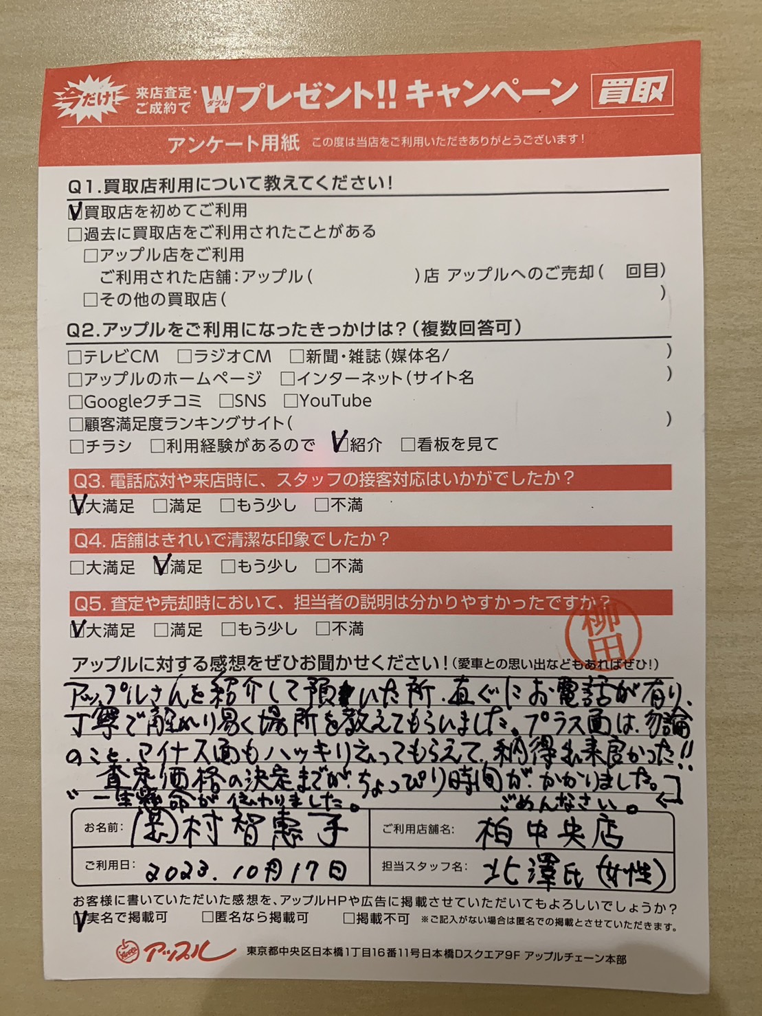 アップルさんを紹介して頂いた所、直ぐにお電話が有り、丁寧で解かり易く場所を教えてもらいました。プラス面は、勿論のこと、マイナス面もハッキリ言ってもらえて、納得出来良かった!!査定価格の決定までがちょっぴり時間がかかりました。←ごめんなさい。一生懸命が伝わりました。