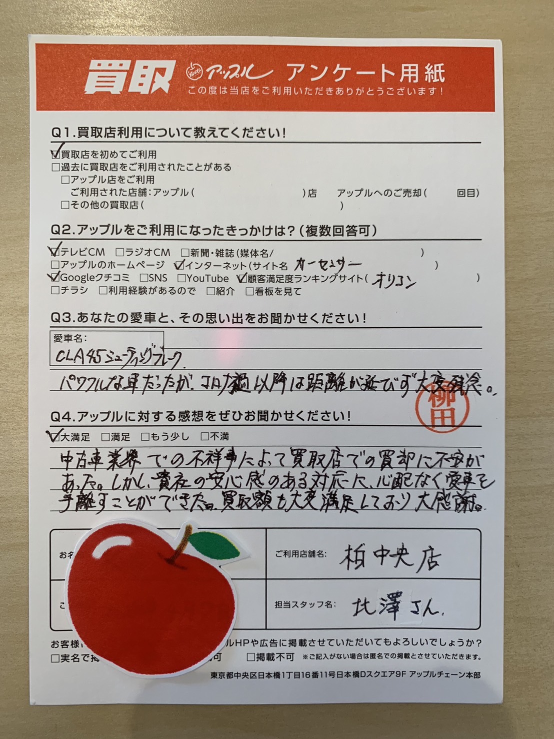 中古車業界での不祥事によって買取店での売却に不安があった。しかし貴社の安心感のある対応に、心配なく愛車を手離すことができた。買取額も大変満足しており大感謝。