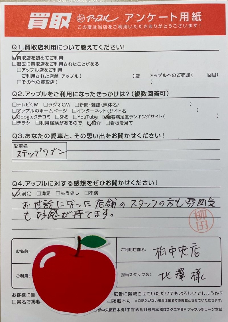 お車のご相談・ 査定だけでもOK! カンタン 入力 30秒 アップルがブランド買取始めました! お電話でも受付中! 受付時間10:00 ~ 19:00 04-7197-4436 お車のご相談・ 査定だけでもOK! カンタン 入力 30秒 アップルがブランド買取始めました! お電話でも受付中! 受付時間10:00 ~ 19:00 04-7197-4436 アップルがブランド買取始めました! お電話でも受付中! 受付時間10:00 ~ 19:00 04-7197-4436 店舗情報 在庫車 スタッフ紹介 ブログ お客様の声 キャンペーン 無料査定 click お客様の声 ご記入日: 2025/02/16 千葉県柏市 S様 車名:ホンダ ステップワゴン Q.愛車名:ステップワゴンンQ.アップルに対する感想をぜひお聞かせください!お世話になった店舗のスタッフの方も雰囲気も好感が持てます。 前へ 次へ お客様の声一覧を見る