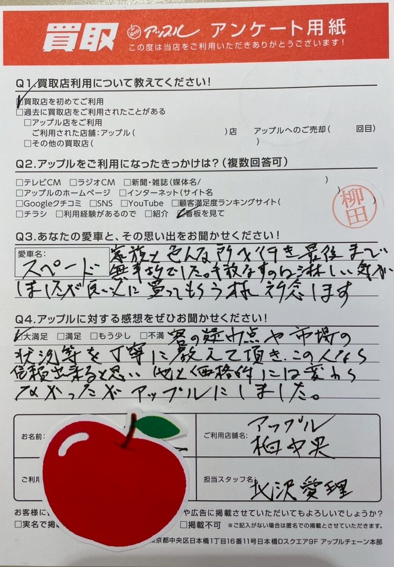 車の疑問点や市場にの状況等を丁寧に教えて頂き、この人なら信頼出来ると思い他と価格的には変わらなかったがアップルにしました。