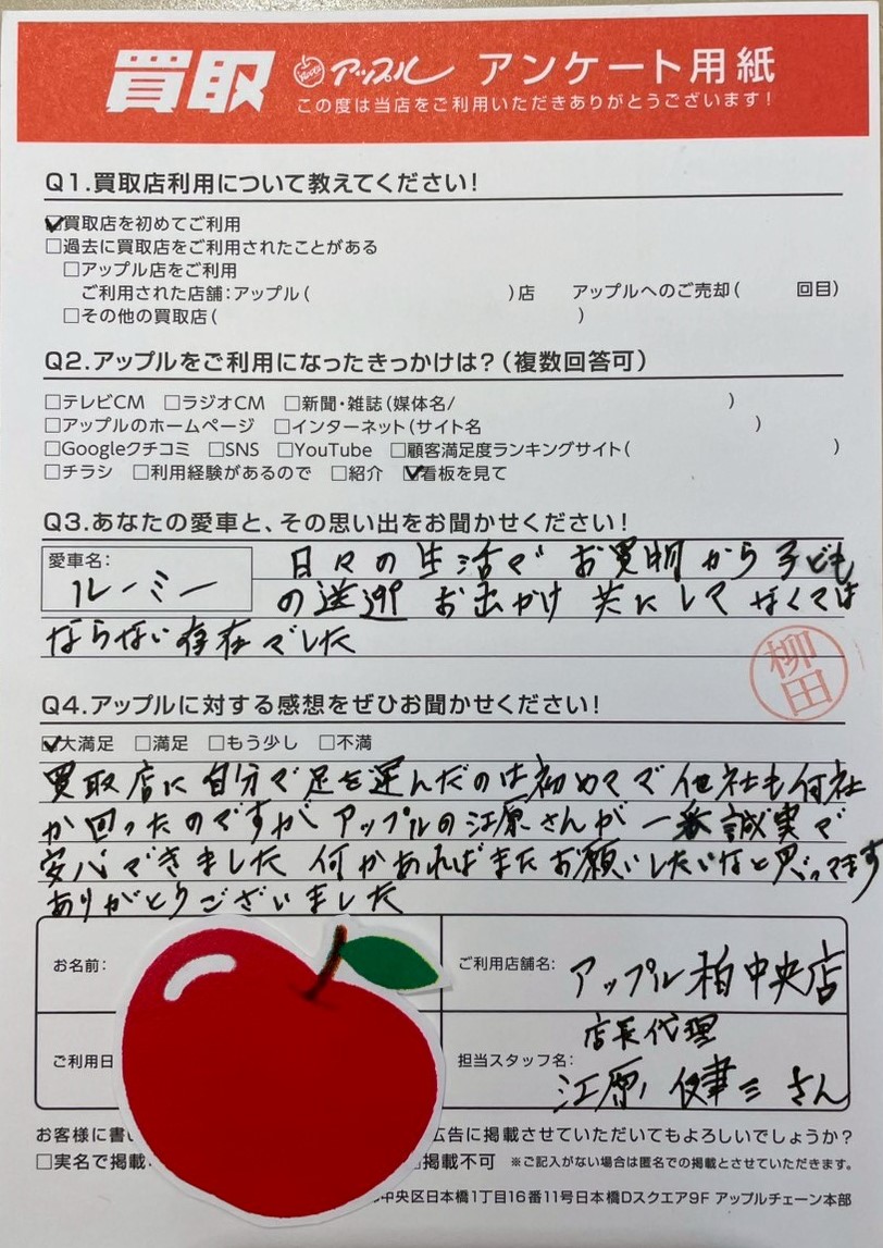 買取店に自分で足を運んだのは初めてで他社も何社か回ったのですがアップルの江原さんが一番誠実で安心できました