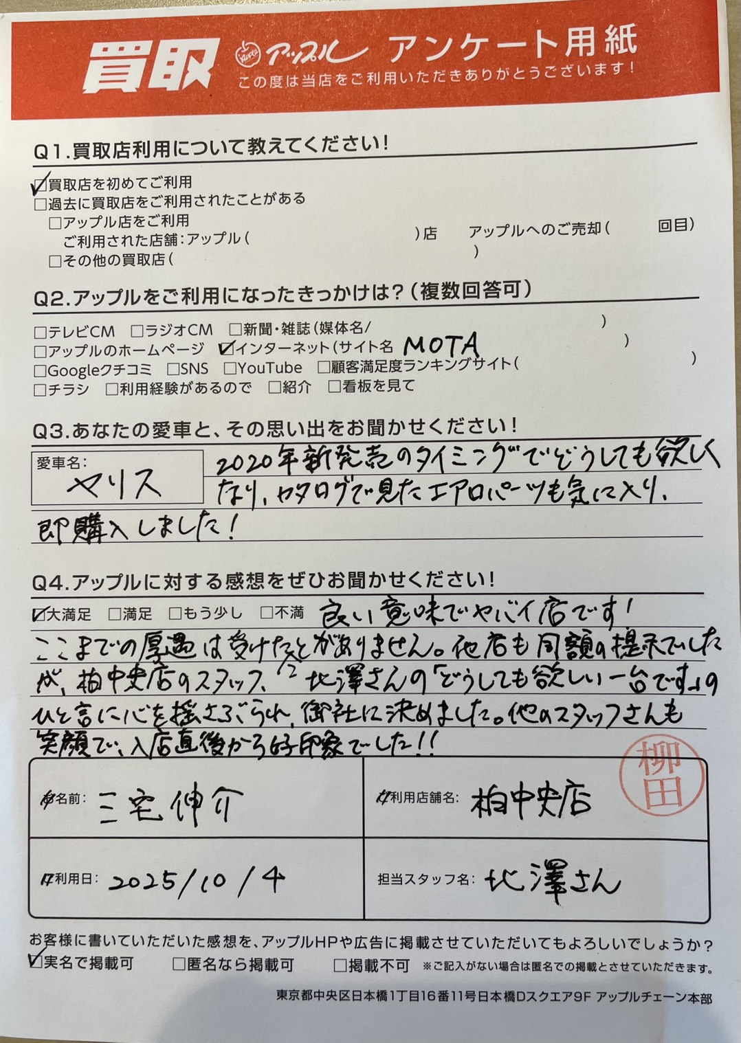 良い意味でヤバイ店です!ここまでの厚遇は受けたことがありません。他店も同額の提示でしたが、柏中央店のスッタフ、北澤さんの「どうしても欲しい一台です」のひと言に心を揺さぶられ、御社に決めました。他のスタッフさんも笑顔で、入店直後から好印象でした!!