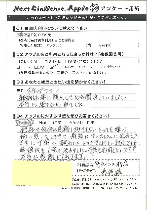 他社で何件か見積もりさせてもらいとっても嫌な怖い思いをしてきて、最後にアップルさんに出会えて本当に丁寧で親切でとてもすばらしい対応でした。値段も1発で決めました。今後も利用したいです!本当に感謝しております。