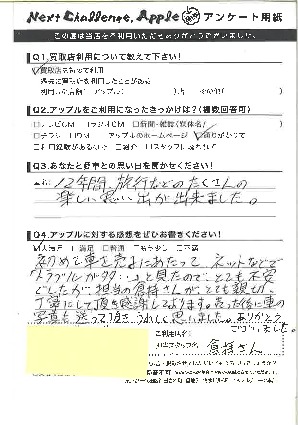 初めて車を売るにあたって、ネットなどで「トラブルが多い」と見たので、とても不安でしたが、担当の倉持さんが、とても親切、丁寧にして頂き感謝しております。売った後に車の写真も送って頂き、うれしく思いました。ありがとうございました。