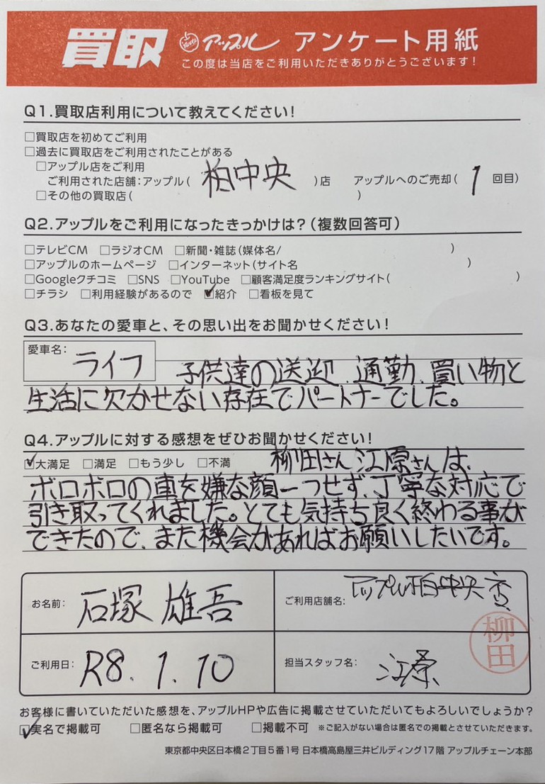 千葉県柏市 石塚 雄吾様 車名:ホンダ ライフ