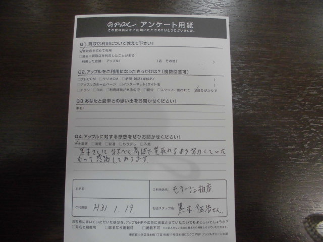 お車のご相談・ 査定だけでもOK! カンタン 入力 30秒 アップルがブランド買取始めました! お電話でも受付中! 受付時間10:00 ~ 19:00 04-7197-4436 お車のご相談・ 査定だけでもOK! カンタン 入力 30秒 アップルがブランド買取始めました! お電話でも受付中! 受付時間10:00 ~ 19:00 04-7197-4436 アップルがブランド買取始めました! お電話でも受付中! 受付時間10:00 ~ 19:00 04-7197-4436 店舗情報 在庫車 スタッフ紹介 ブログ お客様の声 キャンペーン 無料査定 click お客様の声 ご記入日: 2019/01/19 匿名希望 様 黒木さんに、なるべく高値で買取れるように努力して頂いて感謝しております。 前へ 次へ お客様の声一覧を見る