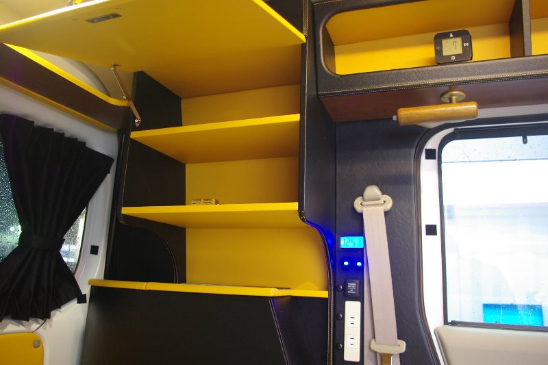 サブバッテリー、ソーラーパネル、外部電源接続ケーブル、冷蔵庫、インバーター、テーブル等がキャンピング装備です。