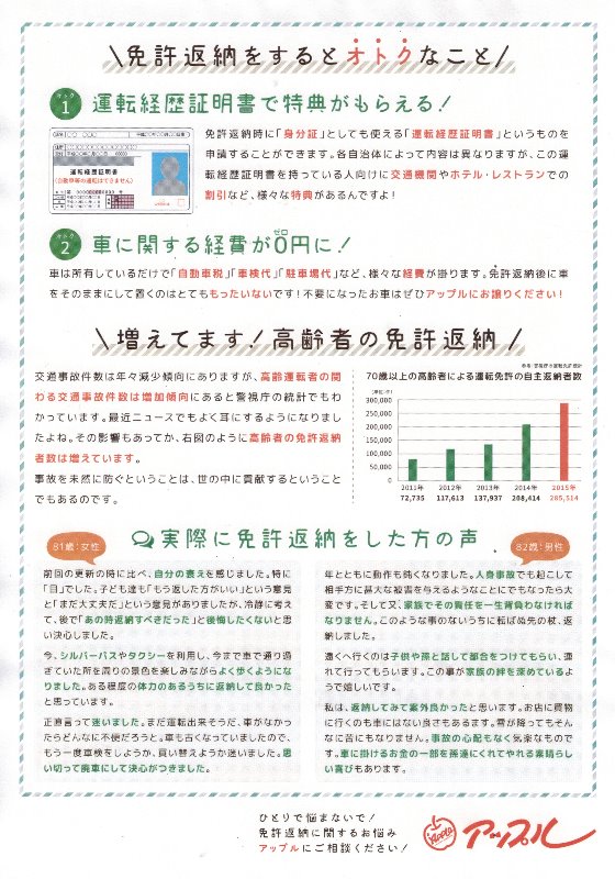 当店も、ささやかではありますが申告いただければ免許返納時の特典をご用意していますのでお申しつけ下さい。
