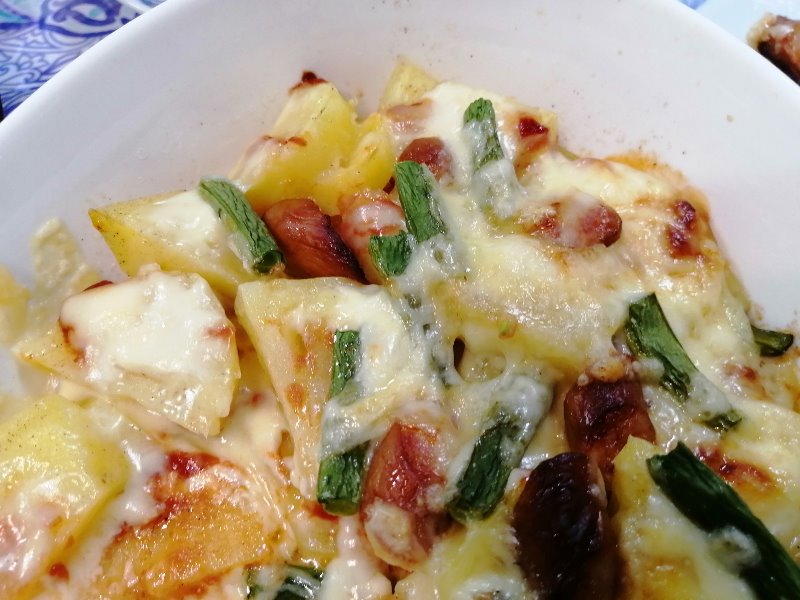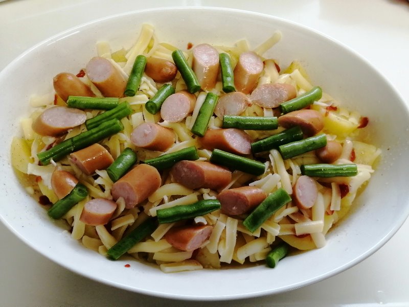 ジャガイモ切ってレンジでチン。並べて、塩コショウ・ケチャップ・マヨネーズ、その上にとろけるチーズとウインナー、色合いでインゲン。