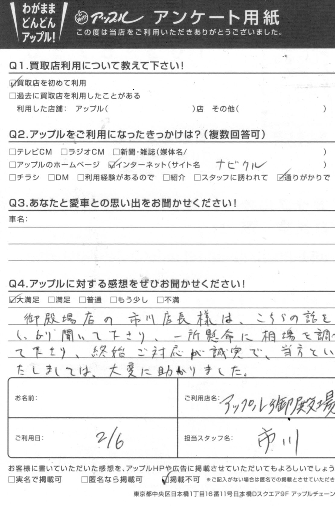 御殿場店の市川店長様は、こちらの話をしっかり聞いて下さり、一生懸命に相場を調べて下さり、終始ご対応が誠実で、
