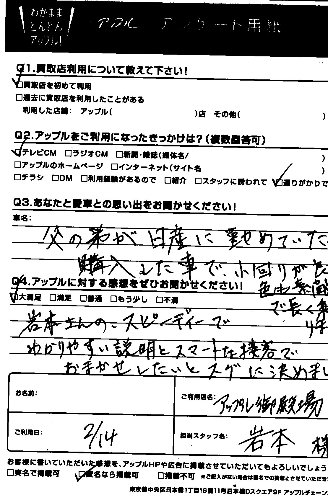 岩本さんの、スピーディーでわかりやすい説明とスマートな接客で、おまかせしたいとスグに決めました