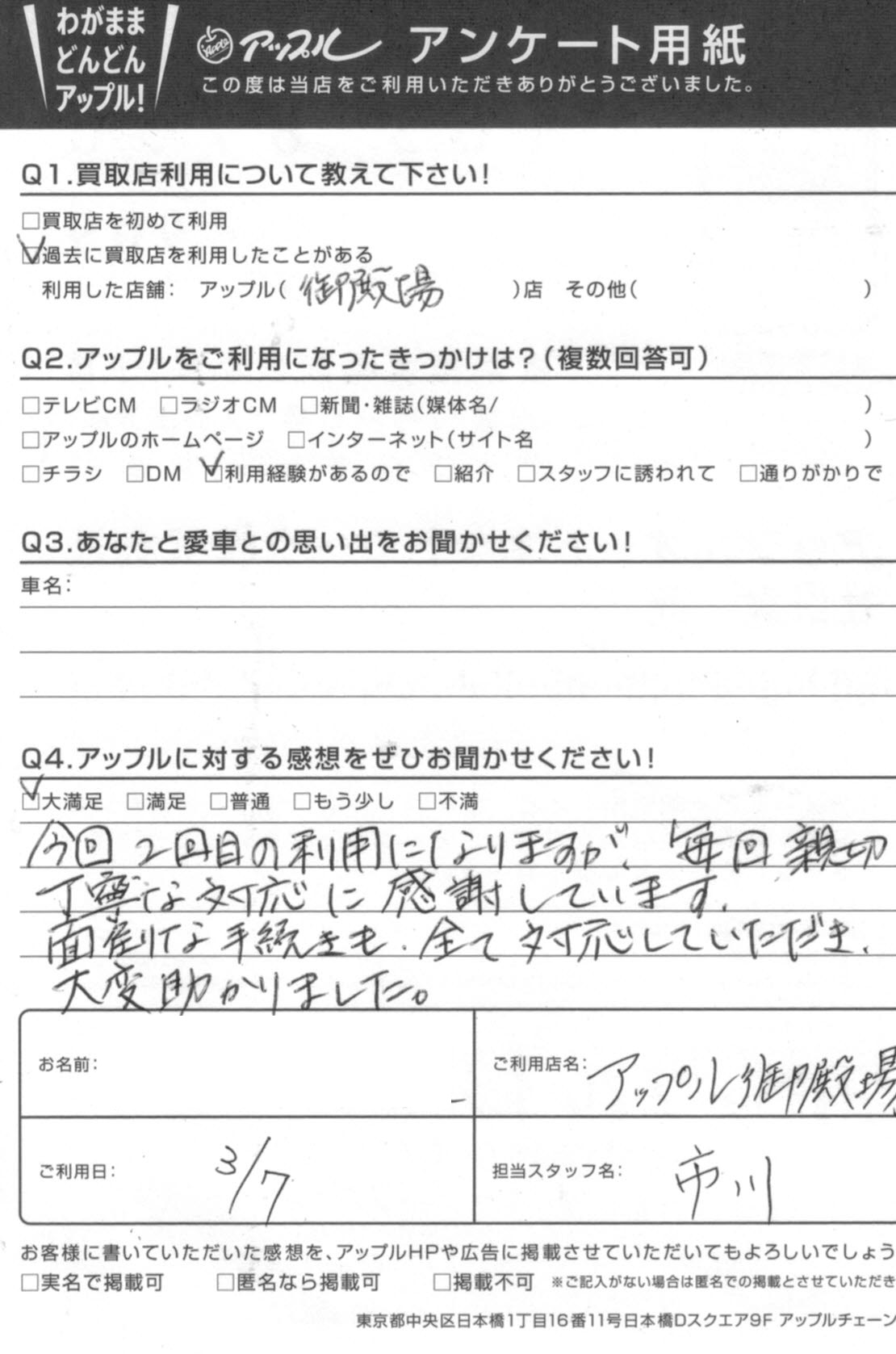 今回2回目の利用になりますが、毎回親切で丁寧な対応に感謝しています。