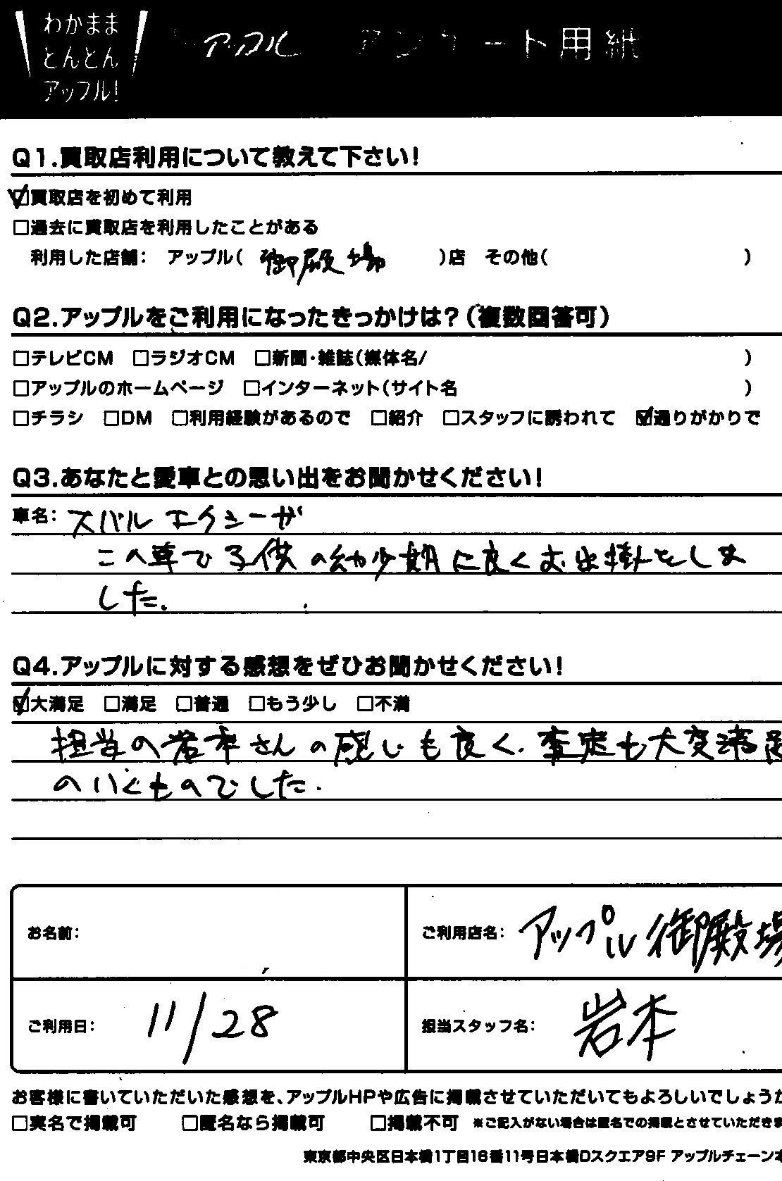 担当の岩本さんの感じもよく、査定も大変満足いくものでした。