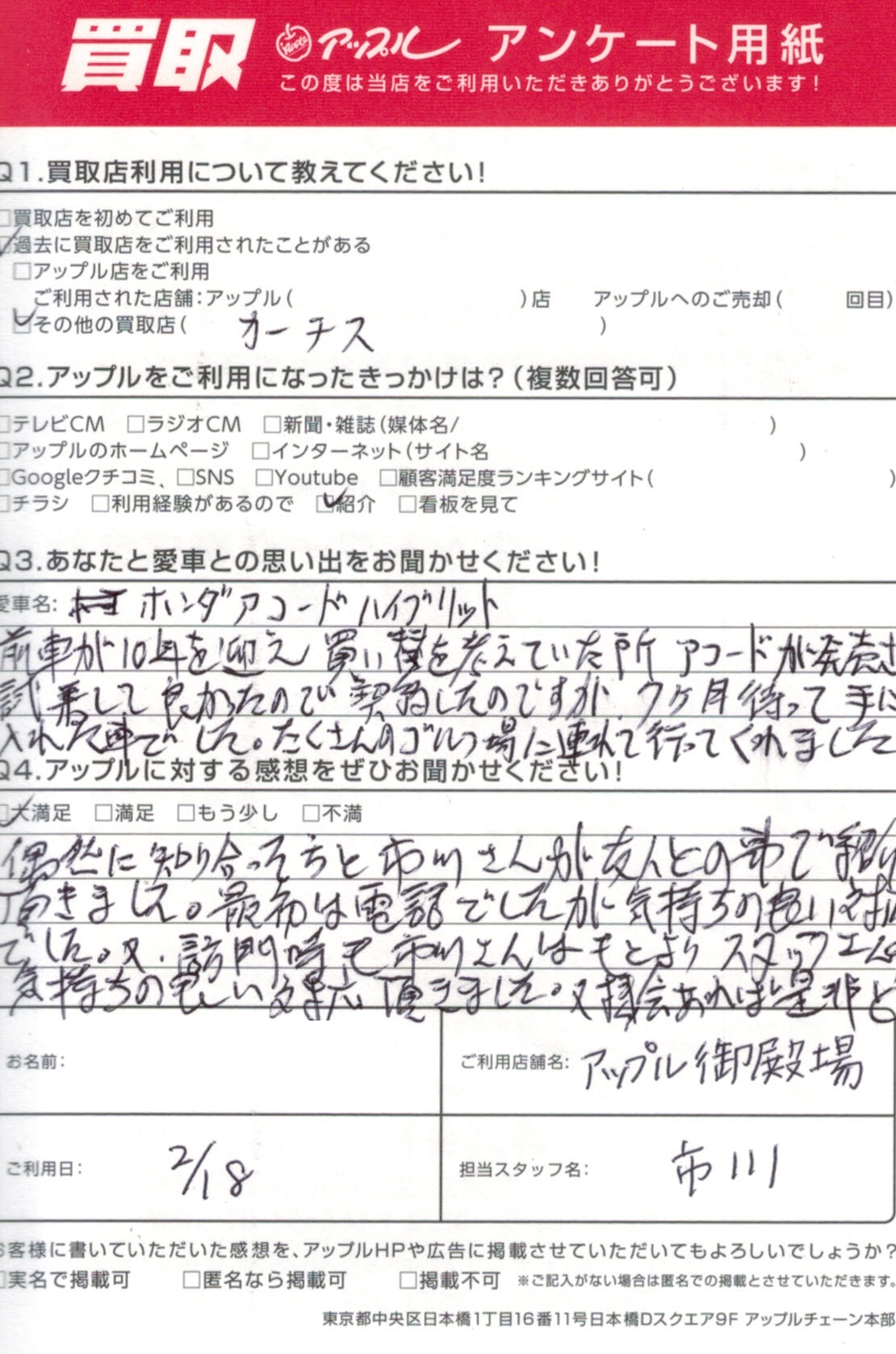 偶然に知り合った方と市川さんが友人との事で紹介頂きました。最初は電話でしたが気持ちの良い対応でした。又、訪問時も市川さんはもとよりスタッフさんの気持ちの良い対応頂きました。又、機会があれば是非と。