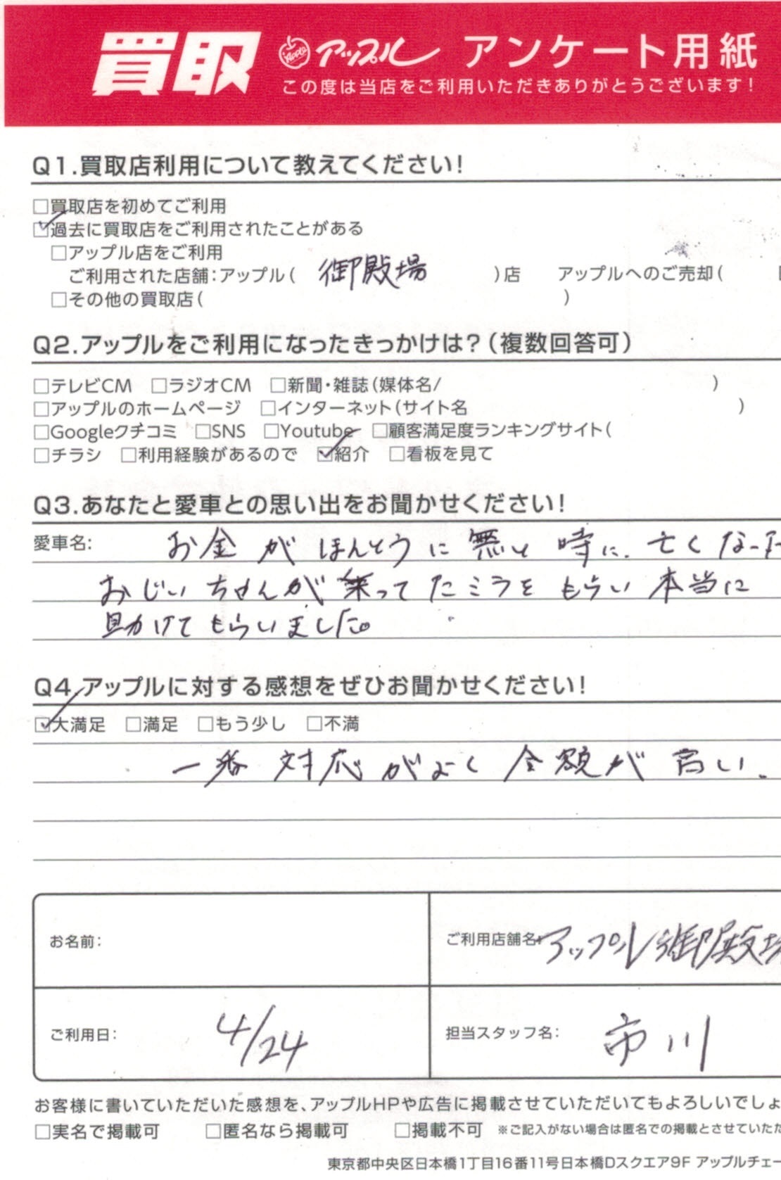 ミラ買取T・Y様 車名:ダイハツ ミラ