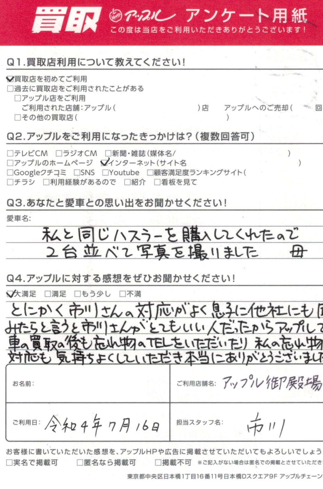 とくかく市川さんの対応がよく息子に他社にも聞いてみたらと言うと市川さんがとてもいい人だったからアップルでっと。車の買取の後も忘れ物のTELをいただいたり、私の忘れ物の対応も気持ちよくしてきただき本当にありがとうございました。 母