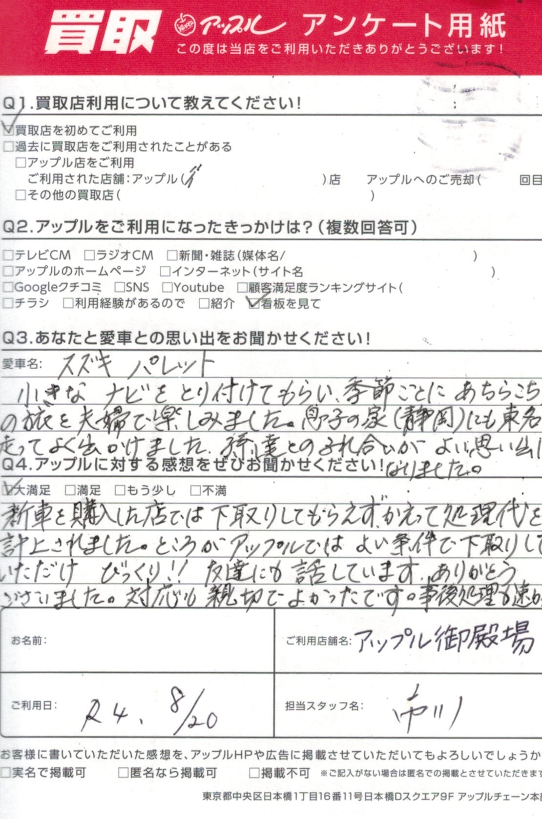 新車を購入した店では下取りがしてもらえずかえって処理代を計上されました。ところがアップルでは良い条件で下取りしていただけびっくり!!友達にも話しています。ありがとうございました。対応も親切でよかったです。事後処理も早かったです。