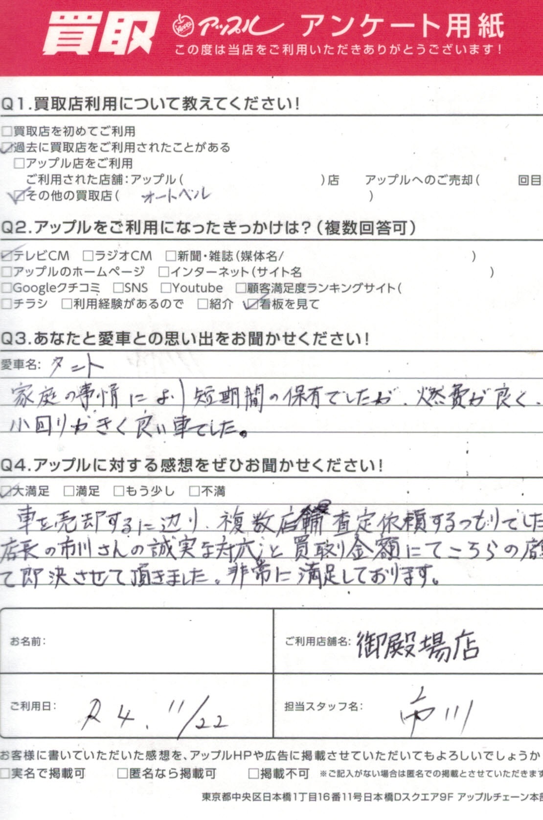 車を売却するに辺り、複数店舗査定依頼するつもりでしたが、店長の市川さんの誠実な対応と買取り金額にてこちらの店舗にて即決させて頂きました。非常に満足しております。