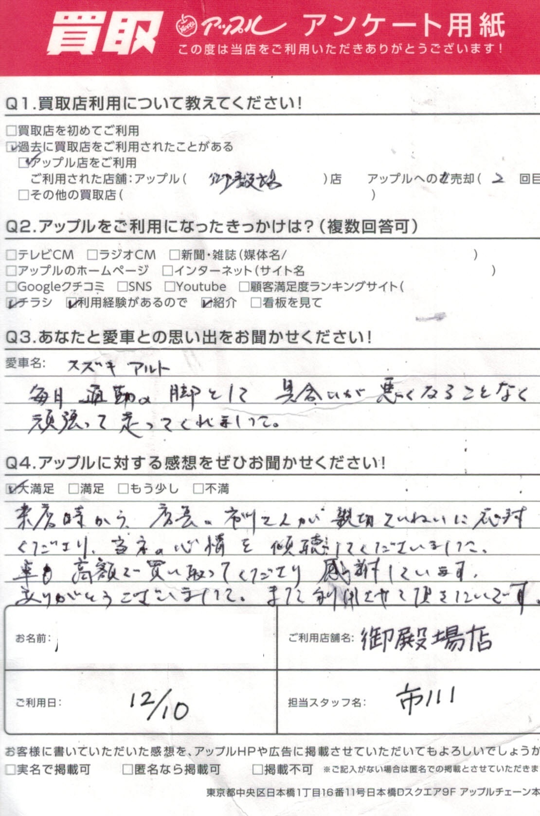 来店時から店長の市川さんが親切ていねいに対応くださり、心情を傾聴してくださいました。車も高額で買い取ってくださり感謝しています。ありがとうございました。また利用させて頂きたいです。