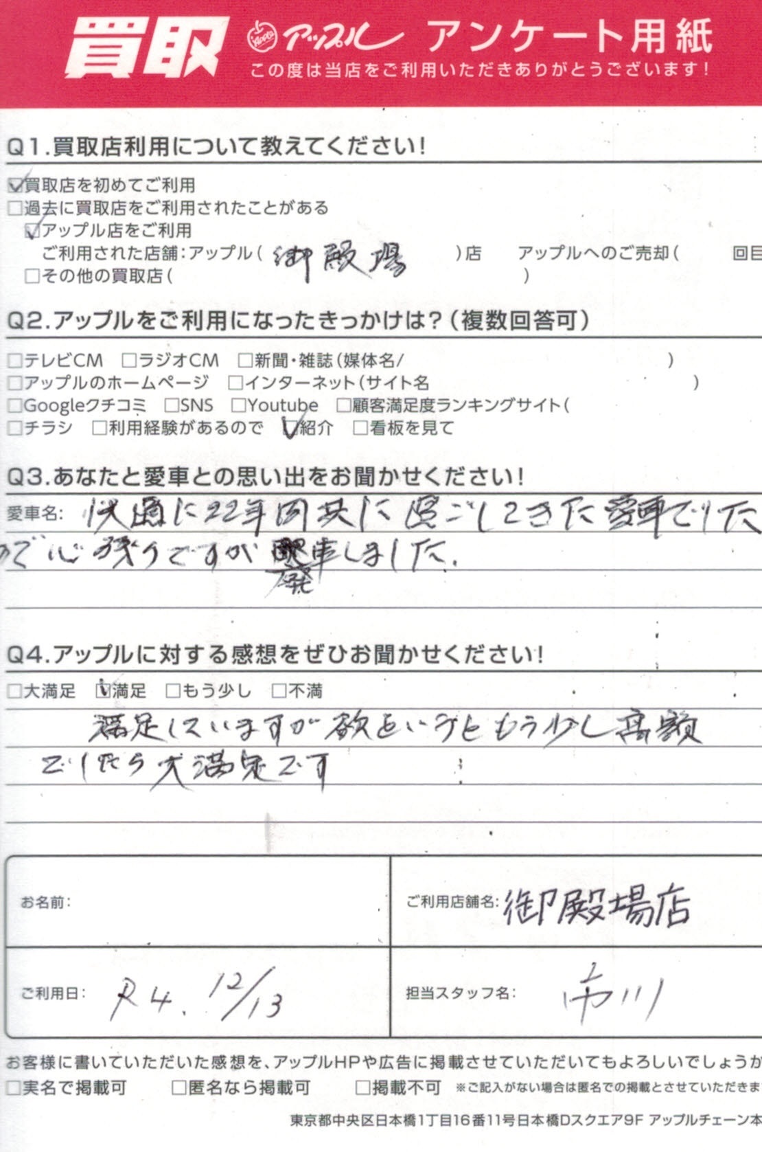 ・アップルに対する感想をぜひお聞かせください!・・・満足