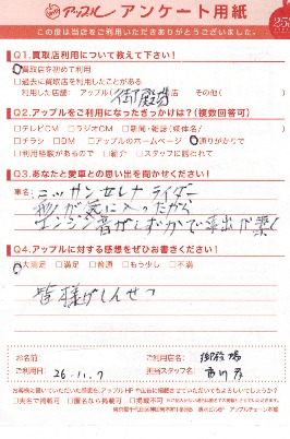 お車のご相談・ 査定だけでもOK! カンタン 入力 30秒 アップルがブランド買取始めました! お電話でも受付中! 受付時間10:00 ~ 18:00 0120-81-3776 お車のご相談・ 査定だけでもOK! カンタン 入力 30秒 アップルがブランド買取始めました! お電話でも受付中! 受付時間10:00 ~ 18:00 0120-81-3776 アップルがブランド買取始めました! お電話でも受付中! 受付時間10:00 ~ 18:00 0120-81-3776 店舗情報 在庫車 スタッフ紹介 ブログ お客様の声 キャンペーン 無料査定 click お客様の声 ご記入日: 2014/11/07 セレナ 買取ご成約 S.H様 皆様がしんせつ 前へ 次へ お客様の声一覧を見る