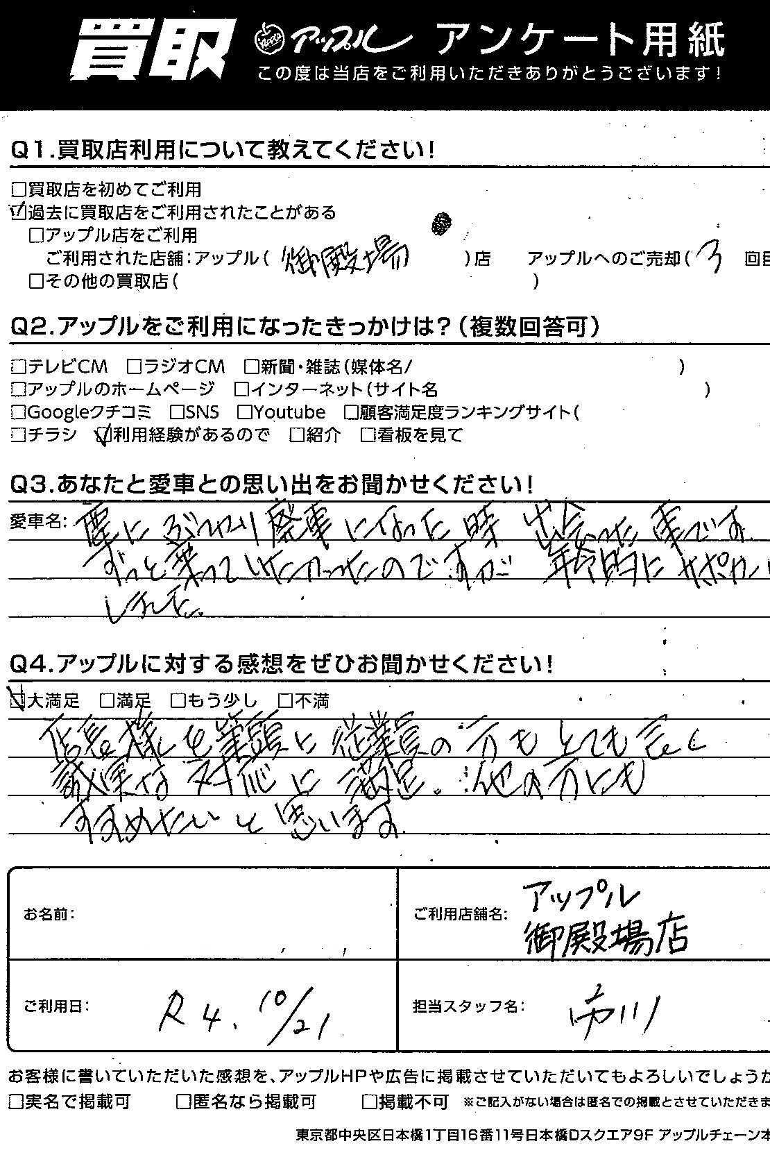 店長様を筆頭に従業員の方もとても良く誠実な対応に満足。他の方にもすすめたいと思います。