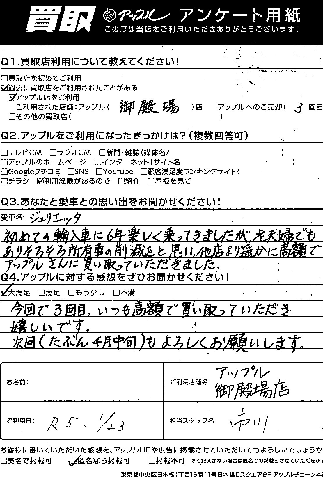 今回で3回目。いつも高額で買い取っていただき嬉しいです。次回(たぶん4月中旬)もよろしくお願いします。