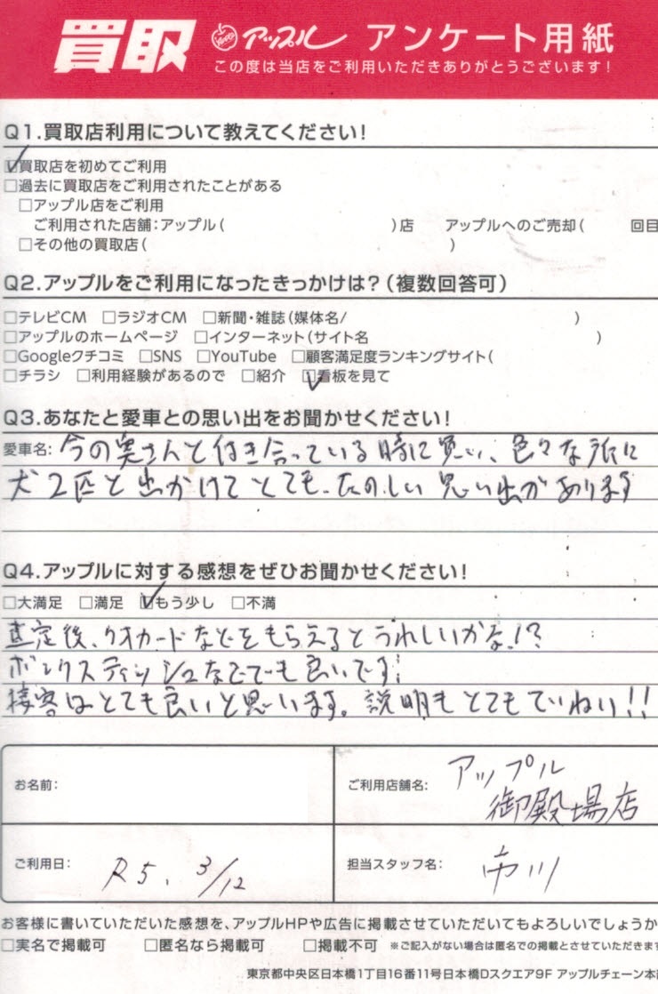 査定後にクオカードなどもらえるとうれしいかな!?ボックスティッシュなどでも良いです。接客はとても良いと思います。説明もとてもていねい!!