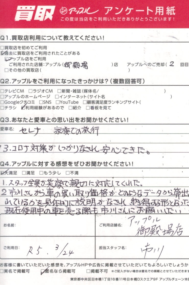 2、市川さんから車の買い取り価格がどのようなデータから算出されているかを具体的に説明がなされ納得する形となった。現在使用中の車を売る際も市川さんにお願いしたい。