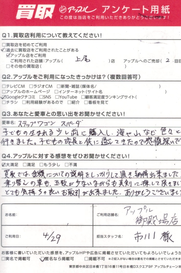 買取では金額についての説明をしっかりして頂き納得出来ました。乗り換えの車も玉数が少ないながらも真剣に探して頂きました。とても気持ちの良いお取引が出来ました。ありがとうございました。