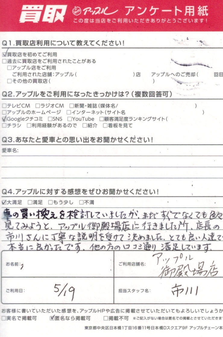 車の買い替えを検討していましたが、まだすぐでなくても色々見てみようとアップル御殿場店に行きました所、店長の市川さんに丁寧な説明を受けて決めました。とても良い人達で本当に良かったです。他の方の口コミ通り満足しています。