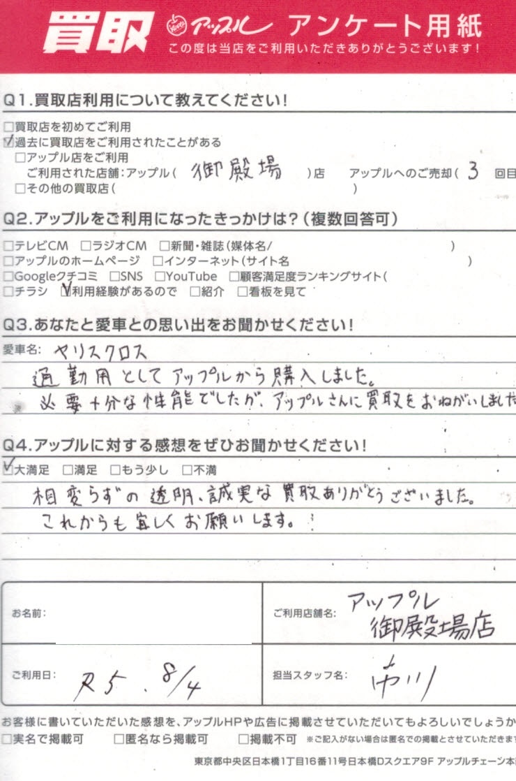 相変わらずの透明・誠実な買取ありがとうございました。これからも宜しくお願いします。
