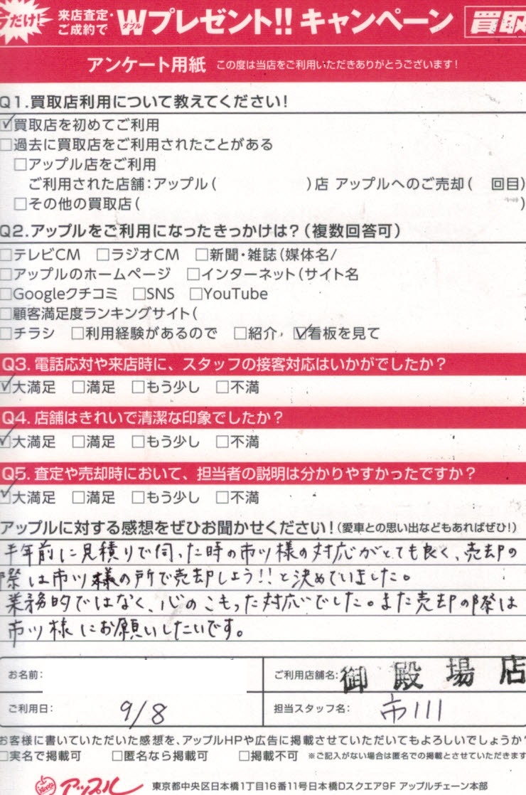 数年前に見積りで伺った時の市川様の対応がとても良く、売却の際は市川様の所で売却しよう!!と決めていました。業務的ではなく、心のこもった対応でした。また売却の際は市川様にお願いしたいです。