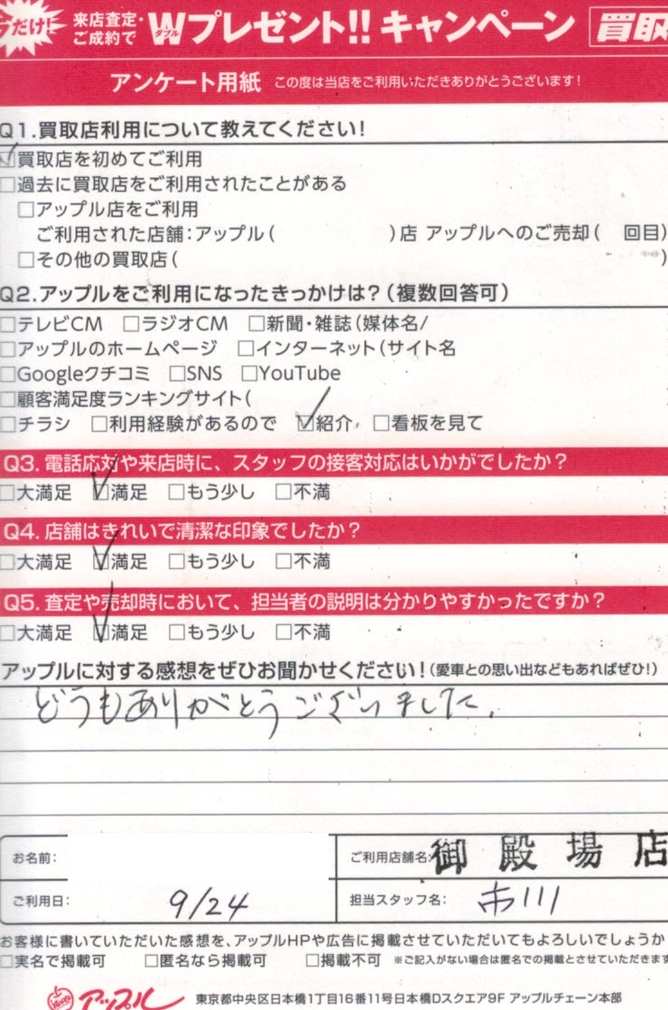お車のご相談・ 査定だけでもOK! カンタン 入力 30秒 アップルがブランド買取始めました! お電話でも受付中! 受付時間10:00 ~ 18:00 0120-81-3776 お車のご相談・ 査定だけでもOK! カンタン 入力 30秒 アップルがブランド買取始めました! お電話でも受付中! 受付時間10:00 ~ 18:00 0120-81-3776 アップルがブランド買取始めました! お電話でも受付中! 受付時間10:00 ~ 18:00 0120-81-3776 店舗情報 在庫車 スタッフ紹介 ブログ お客様の声 キャンペーン 無料査定 click お客様の声 ご記入日: 2023/11/24 ノート買取T・K様 車名:日産 ノート ・アップルに対する感想をぜひお聞かせください!どうもありがとうございました。担当 市川 前へ 次へ お客様の声一覧を見る