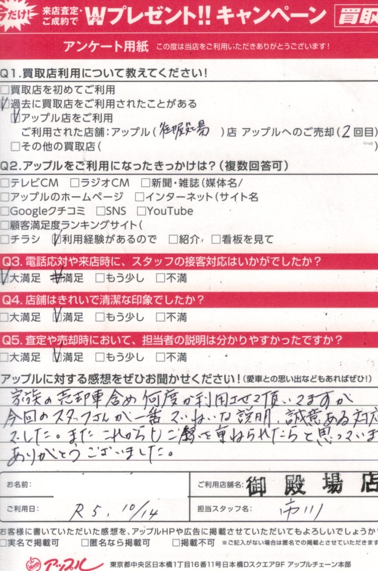 家族の売却車含め何度か利用させて頂いてますが、今回のスタッフさんが一番丁寧な説明、誠意ある対応でした。またこれからもご縁を重ねられたらと思っています。ありがとうございました。