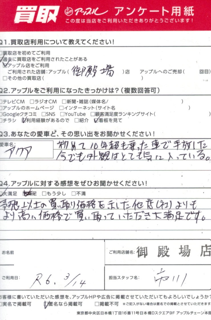 アクア買取I・K様 車名:トヨタ アクア