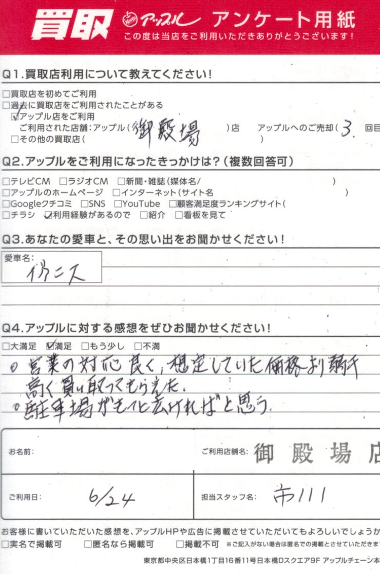 お車のご相談・ 査定だけでもOK! カンタン 入力 30秒 アップルがブランド買取始めました! お電話でも受付中! 受付時間10:00 ~ 18:00 0120-81-3776 お車のご相談・ 査定だけでもOK! カンタン 入力 30秒 アップルがブランド買取始めました! お電話でも受付中! 受付時間10:00 ~ 18:00 0120-81-3776 アップルがブランド買取始めました! お電話でも受付中! 受付時間10:00 ~ 18:00 0120-81-3776 店舗情報 在庫車 スタッフ紹介 ブログ お客様の声 キャンペーン 無料査定 click お客様の声 ご記入日: 2024/06/24 イグニスT・Y様 車名:スズキ イグニス ・アップルに対する感想をぜひお聞かせください!・・・満足営業の対応良く、想定していた価格より若干高く買い取ってもらえた。駐車場がもっと広ければと思う。担当 市川 前へ 次へ お客様の声一覧を見る