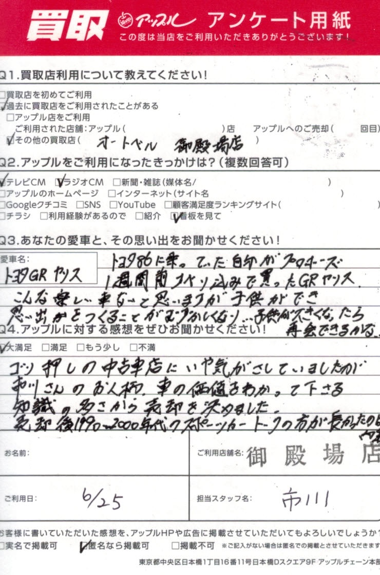 ゴリ押しの中古車店に嫌気がさしていましたが市川さんのお人柄、車の価値をわかって下さる知識の多さから売却を決めました。売却後1990~2000年代のスポーツカートークの方が長かったのは内緒...