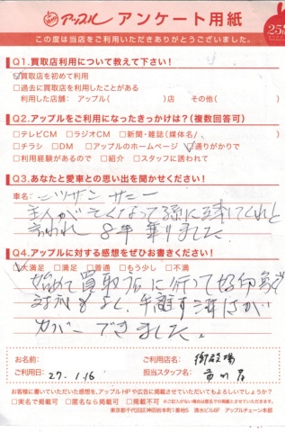 お車のご相談・ 査定だけでもOK! カンタン 入力 30秒 アップルがブランド買取始めました! お電話でも受付中! 受付時間10:00 ~ 18:00 0120-81-3776 お車のご相談・ 査定だけでもOK! カンタン 入力 30秒 アップルがブランド買取始めました! お電話でも受付中! 受付時間10:00 ~ 18:00 0120-81-3776 アップルがブランド買取始めました! お電話でも受付中! 受付時間10:00 ~ 18:00 0120-81-3776 店舗情報 在庫車 スタッフ紹介 ブログ お客様の声 キャンペーン 無料査定 click お客様の声 ご記入日: 2015/01/16 サニー 買取ご成約 Y.W様 ☆頂きましたアップルに対する感想・・満足初めて買取店に行って好印象で対応もよく、手放す淋しさがカバー出来ました。 前へ 次へ お客様の声一覧を見る