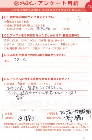 お車のご相談・ 査定だけでもOK! カンタン 入力 30秒 アップルがブランド買取始めました! お電話でも受付中! 受付時間10:00 ~ 18:00 0120-81-3776 お車のご相談・ 査定だけでもOK! カンタン 入力 30秒 アップルがブランド買取始めました! お電話でも受付中! 受付時間10:00 ~ 18:00 0120-81-3776 アップルがブランド買取始めました! お電話でも受付中! 受付時間10:00 ~ 18:00 0120-81-3776 店舗情報 在庫車 スタッフ紹介 ブログ お客様の声 キャンペーン 無料査定 click お客様の声 ご記入日: 2015/03/08 ワゴンR 買取ご成約 i.k様 ☆頂きましたアップルに対する感想・・満足気持ちの良い接客をしていただきました。もう少し買取値段が上がると最高でした(笑) 前へ 次へ お客様の声一覧を見る