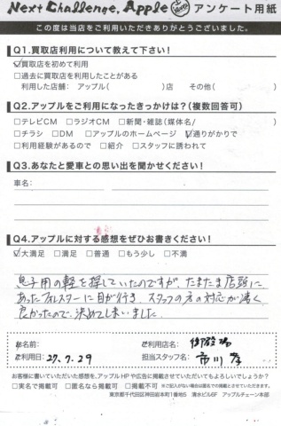 お車のご相談・ 査定だけでもOK! カンタン 入力 30秒 アップルがブランド買取始めました! お電話でも受付中! 受付時間10:00 ~ 18:00 0120-81-3776 お車のご相談・ 査定だけでもOK! カンタン 入力 30秒 アップルがブランド買取始めました! お電話でも受付中! 受付時間10:00 ~ 18:00 0120-81-3776 アップルがブランド買取始めました! お電話でも受付中! 受付時間10:00 ~ 18:00 0120-81-3776 店舗情報 在庫車 スタッフ紹介 ブログ お客様の声 キャンペーン 無料査定 click お客様の声 ご記入日: 2015/07/29 フォレスターご購入 H.M様 ☆頂きましたアップルへのご感想・・大満足息子用の軽を探していたのですが、たまたま店頭にあったフォレスターに目が行き、スタッフの方の対応が凄く良かったので決めてしまいました。 前へ 次へ お客様の声一覧を見る